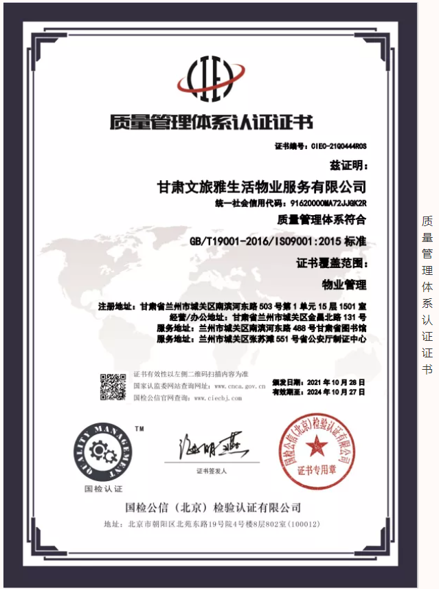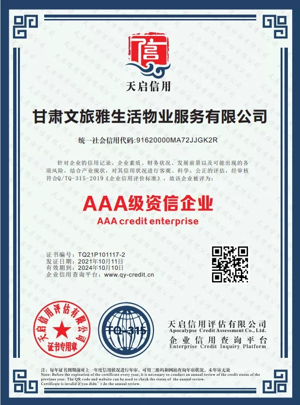 2021年,甘肅文旅雅生活物業(yè)服務(wù)有限公司認(rèn)真貫徹落實(shí)習(xí)近平新時(shí)代中國(guó)特色社會(huì)主義思想,堅(jiān)決落實(shí)集團(tuán)公司各項(xiàng)決策部署。按照集團(tuán)公司高質(zhì)量發(fā)展要求,結(jié)合自身發(fā)展需要,公司于9月份正式啟動(dòng)3A體系認(rèn)證工作,經(jīng)過(guò)權(quán)威認(rèn)證機(jī)構(gòu)對(duì)公司信用管理、制度建設(shè)、管理體系等方面綜合評(píng)估,10月底公司順利通過(guò)3A體系認(rèn)證,使得公司在管理水平、制度建設(shè)方面有了進(jìn)一步完善及提升,增強(qiáng)了公司核心競(jìng)爭(zhēng)力和品牌影響力,為公司高質(zhì)量發(fā)展奠定了堅(jiān)實(shí)的基礎(chǔ)。
